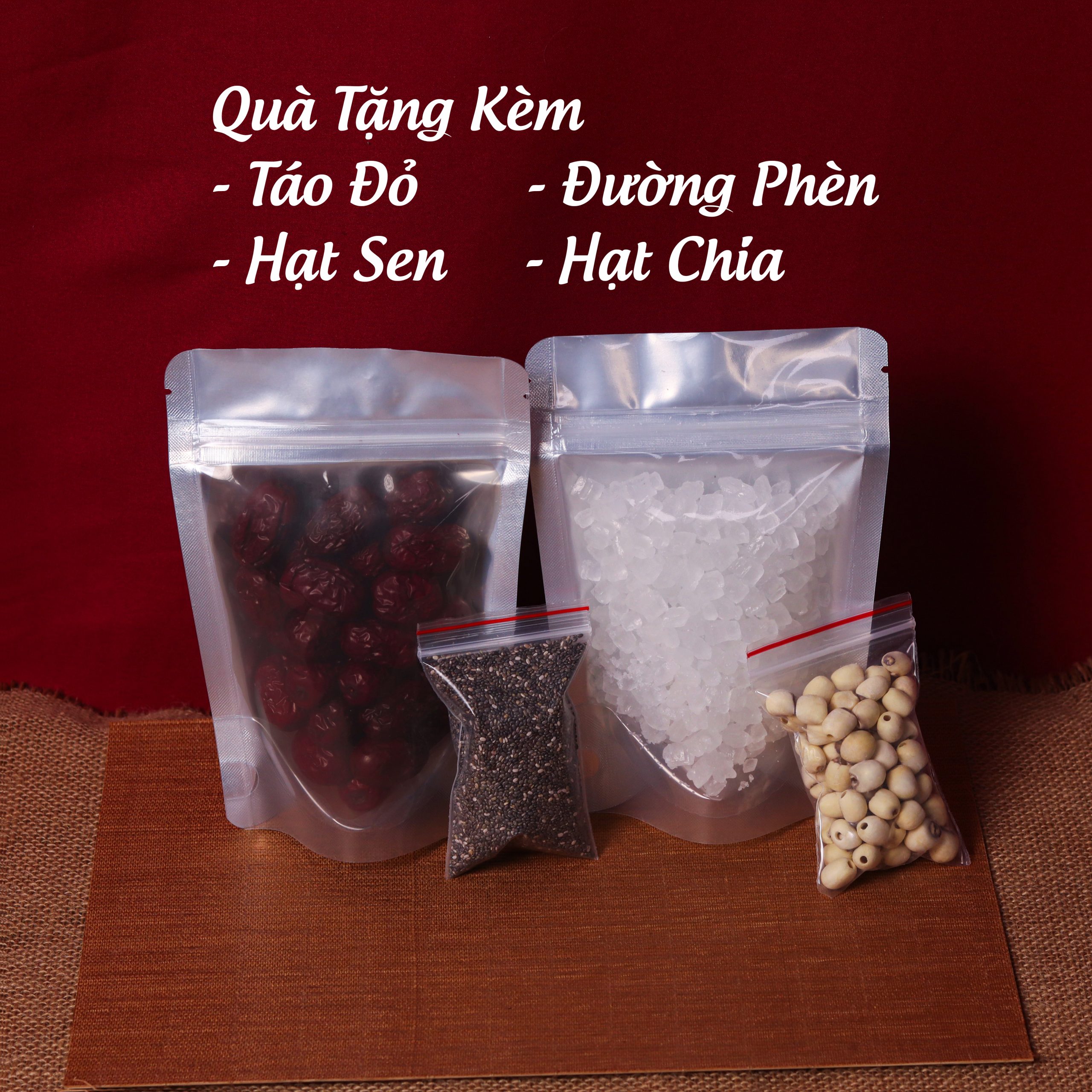 – Tặng Táo Đỏ, Đường Phèn, Hạt Chia, Hạt Sen Mô Tả Sản Phẩm Tặng kèm: Táo Đỏ, Hạt Chia, Hạt Sen, Đường Phèn. Yến khô: Độ ẩm thấp, nở nhiều khi chưng.